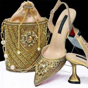 Shining Golden Wedding Sandals with Matching Bag Party Shoes