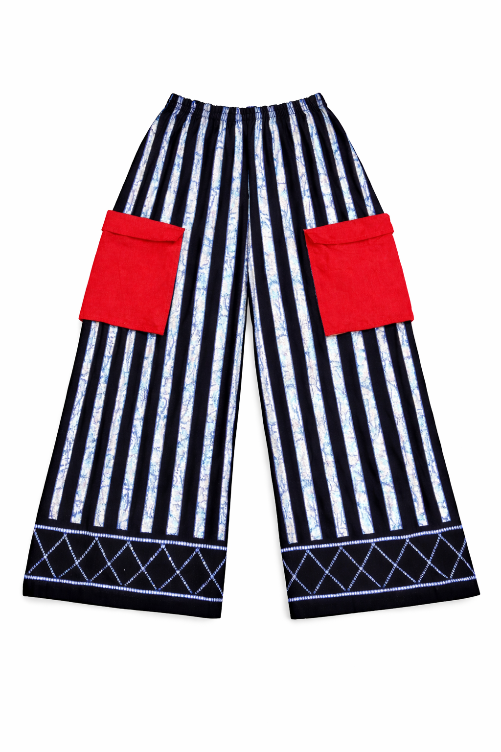 These bottoms share the same vibrant wavy stripe and circular Ankara print as the Classic High-Waist model.