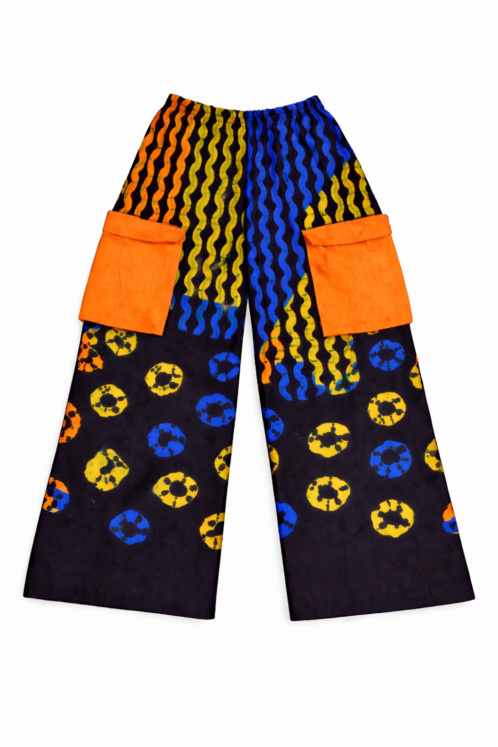 Sharing a similar print to the first pair, these bottoms feature vibrant wavy stripes and circular patterns in yellow, orange, and blue.