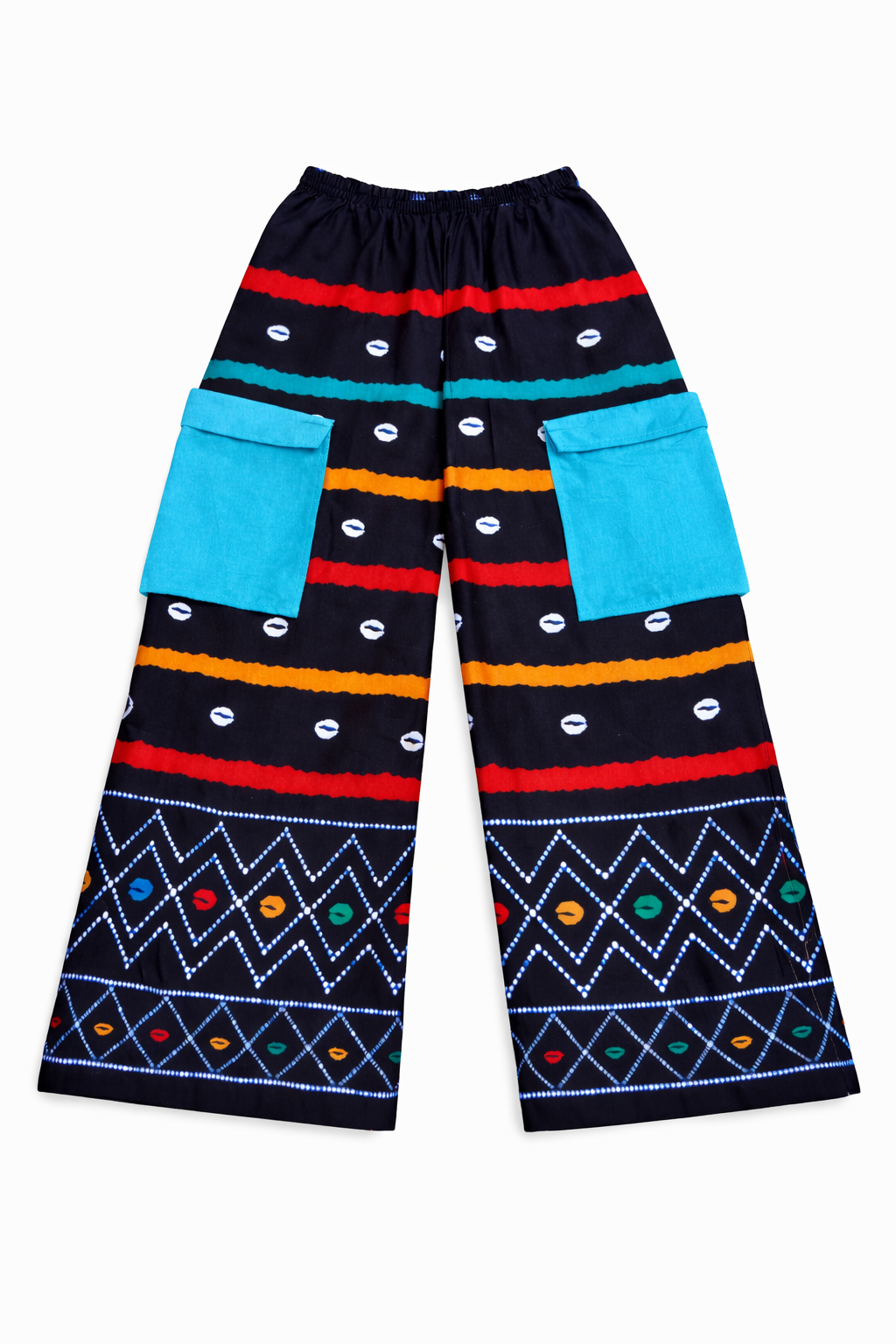 These palazzo-style pants feature the “Heritage” horizontal stripe and cowrie shell pattern on a black background.