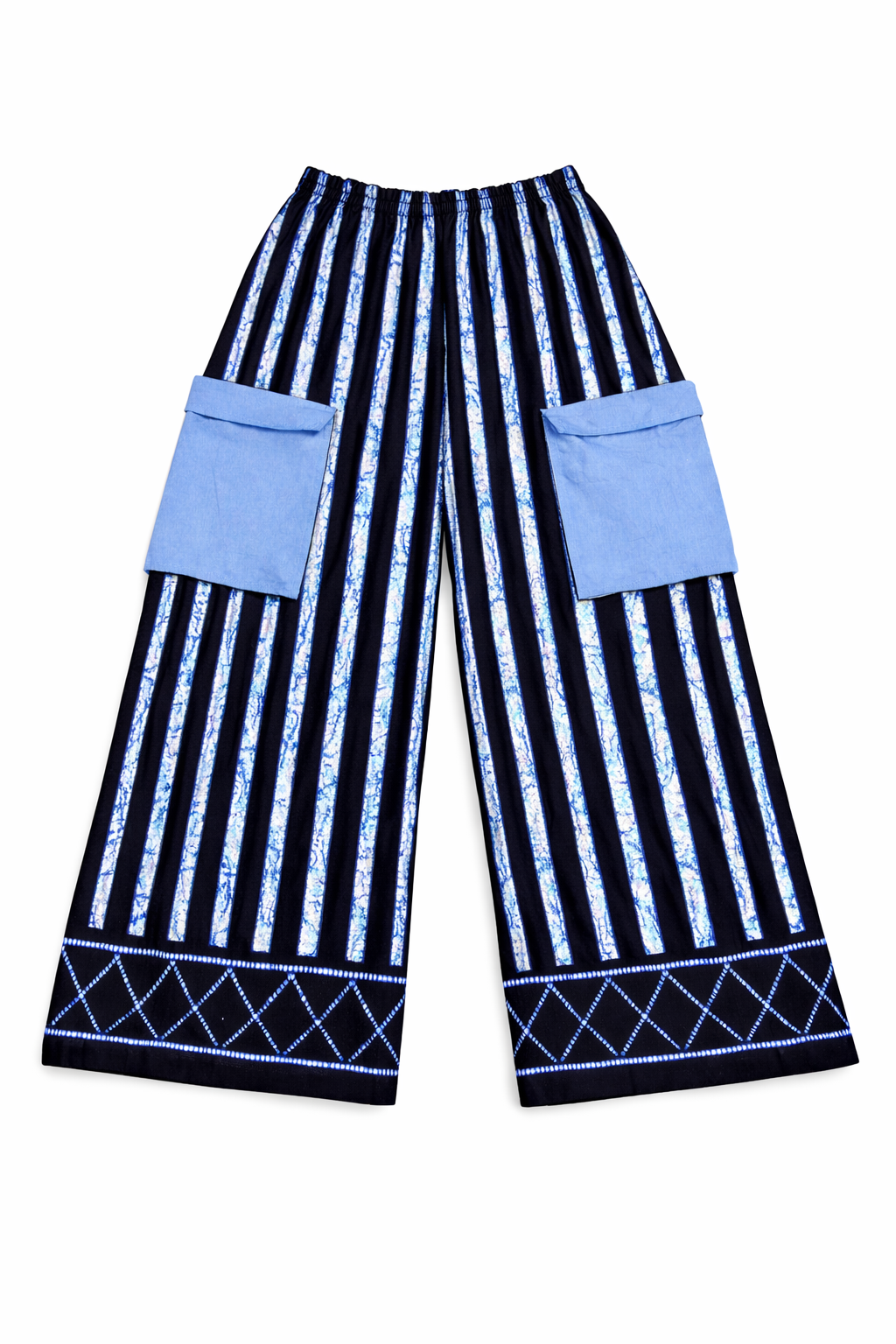 These wide-leg trousers feature a sophisticated vertical stripe pattern in white and blue against a black base, finished with a diamond-patterned border at the hem.