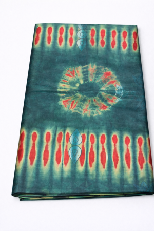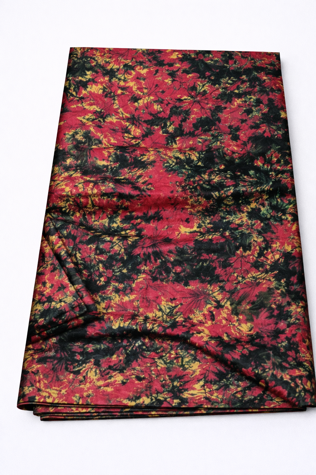 Unlike the radial sunburst designs, this piece features an all-over organic pattern reminiscent of falling leaves. It utilizes a rich palette of fiery red, golden yellow, and deep black ink splashes. The complex layering of colors creates a textured, marbled effect perfect for sophisticated traditional or contemporary attire.