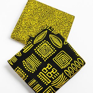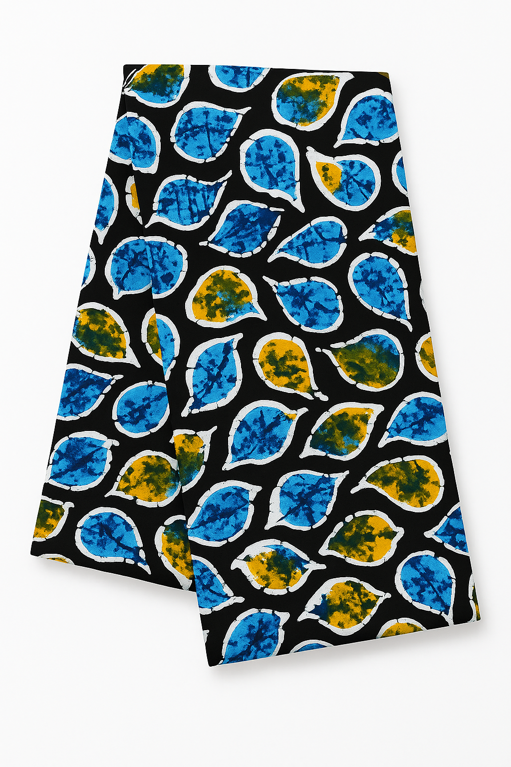 A striking all-over pattern of stylized, organic leaf shapes set against a solid black background. Each leaf features a marbled blue and yellow interior, outlined by a distinct white wax-resist border. The abstract, hand-painted look within the leaves highlights the authentic batik-inspired printing process.