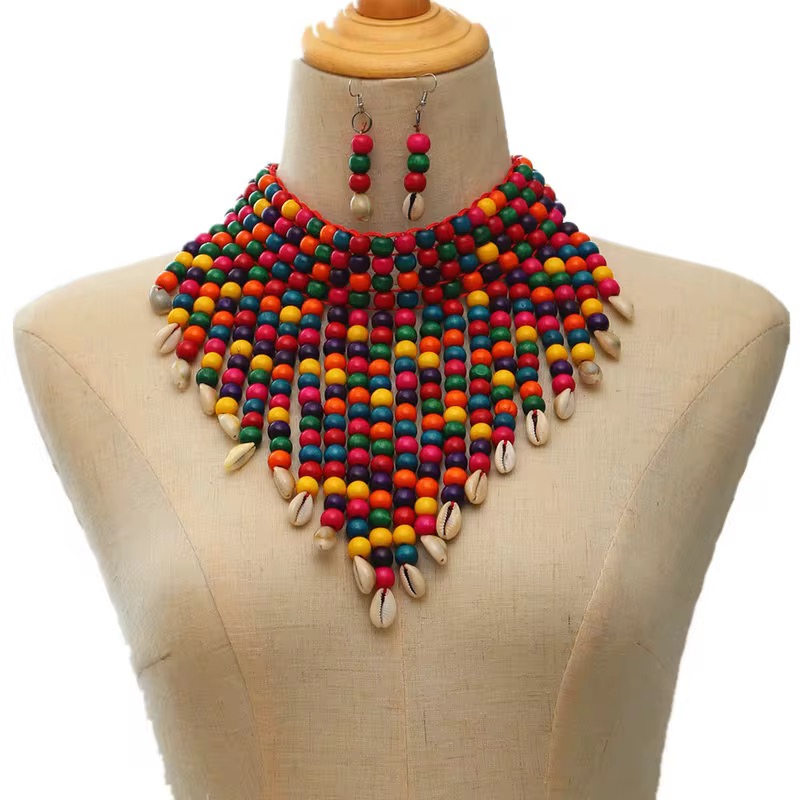 Colorful Handmade Wooden Bead Tassel Necklace Set