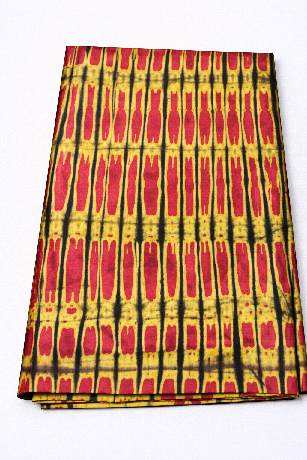 This vibrant Adire Kampala fabric features a striking tri-color palette of crimson red, golden yellow, and deep charcoal black. Traditionally handcrafted in Nigeria using a resist-dyeing technique, the pattern showcases vertical “crack” or “bone” motifs that create a rhythmic, elongated aesthetic.