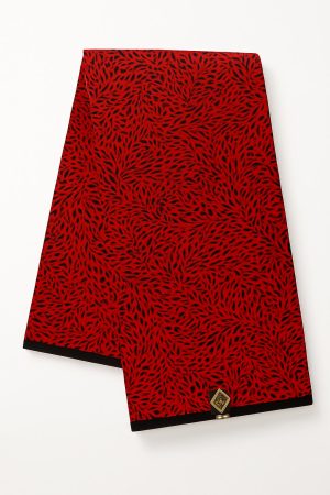 : This set exudes warmth and elegance. The top fabric features a dense, rhythmic black leaf pattern set against a deep crimson red. The companion fabric is a complex geometric design with a golden-yellow honeycomb grid overlaying dark floral bursts and circular dotted accents. A classic choice for high-end bespoke dresses and traditional ensembles.