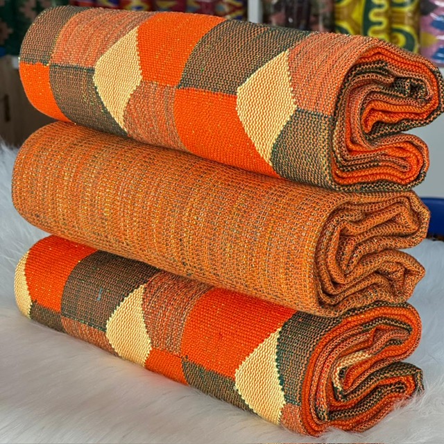 Vibrant orange and beige handwoven Kente fabric from Ghana, crafted with care and cultural pride. This 6-yard traditional textile is ideal for making statement outfits, headwraps, or ceremonial attire.