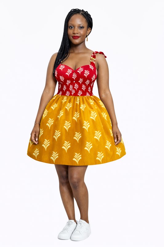 This is the Jioni African Print Corset Mini Dress by D’Iyanu, featuring a vibrant “Sunset Leaves” pattern.