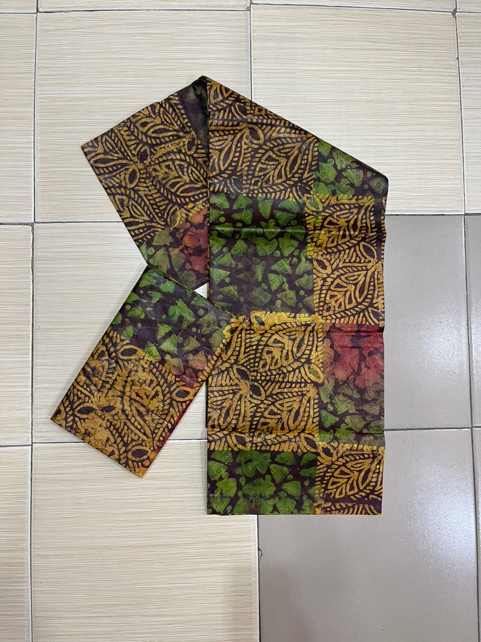This 5-yard premium batik brocade fabric showcases a rich green and gold design on 100% cotton. Perfect for crafting elegant traditional garments or unique decor, it embodies a blend of cultural heritage and luxurious style.