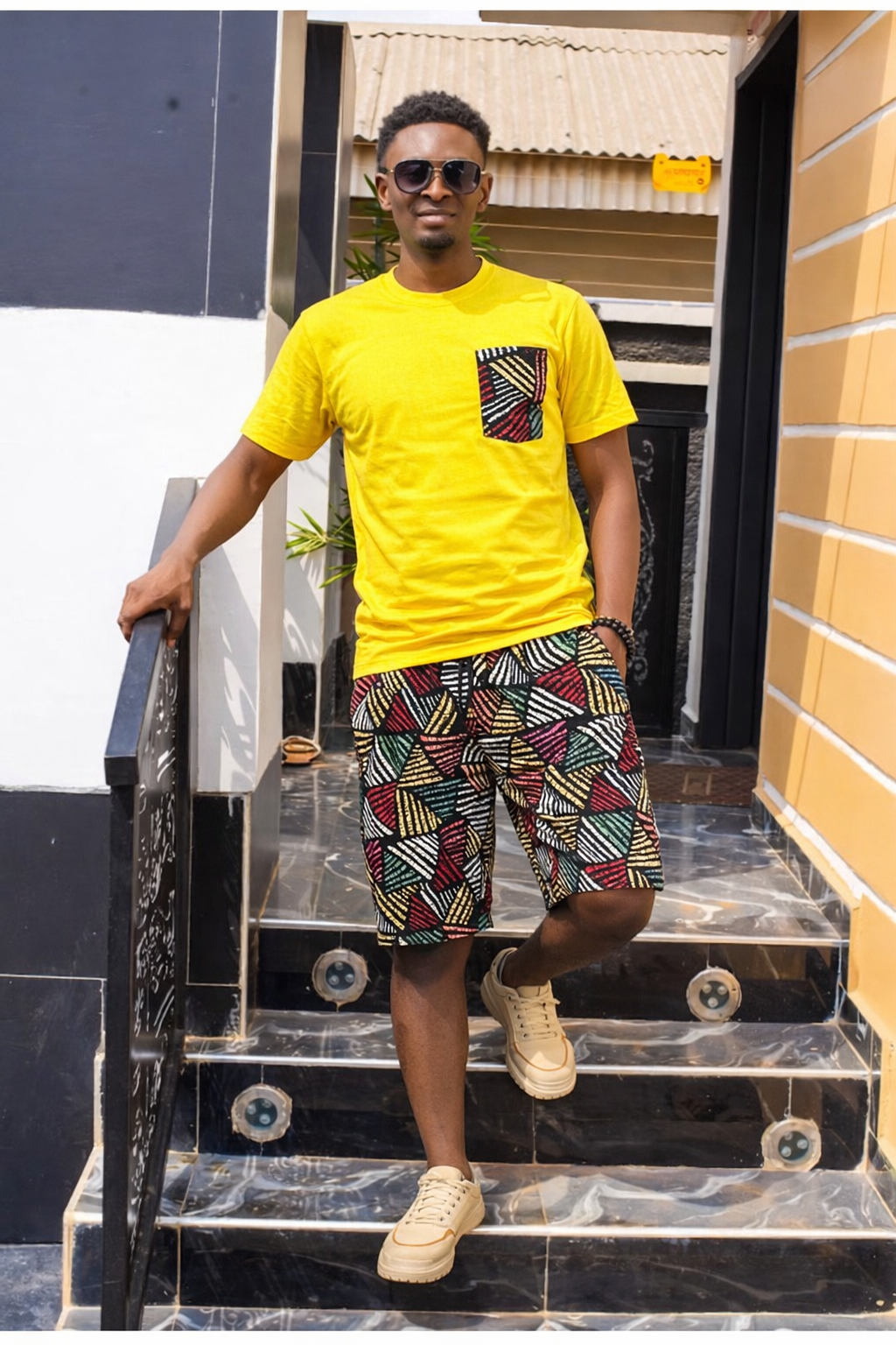 Embrace a vibrant, relaxed look with this 2-piece casual set designed for comfort and style. The outfit consists of a bright yellow t-shirt featuring a stylish Ankara print pocket patch, paired with matching Ankara print shorts. The multi-colored geometric pattern on the shorts and pocket adds a playful, authentic African flair to a classic leisurewear staple.