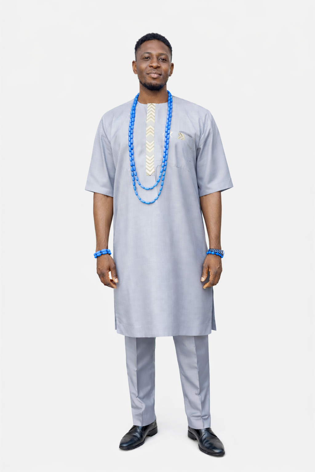 Elevate your cultural wardrobe with this premium 2-piece Senator set, meticulously crafted for the modern man who values tradition and sophistication. This ensemble features a longline steel grey tunic adorned with minimalist geometric embroidery along the placket and chest, paired with matching tailored trousers for a streamlined, authoritative silhouette.