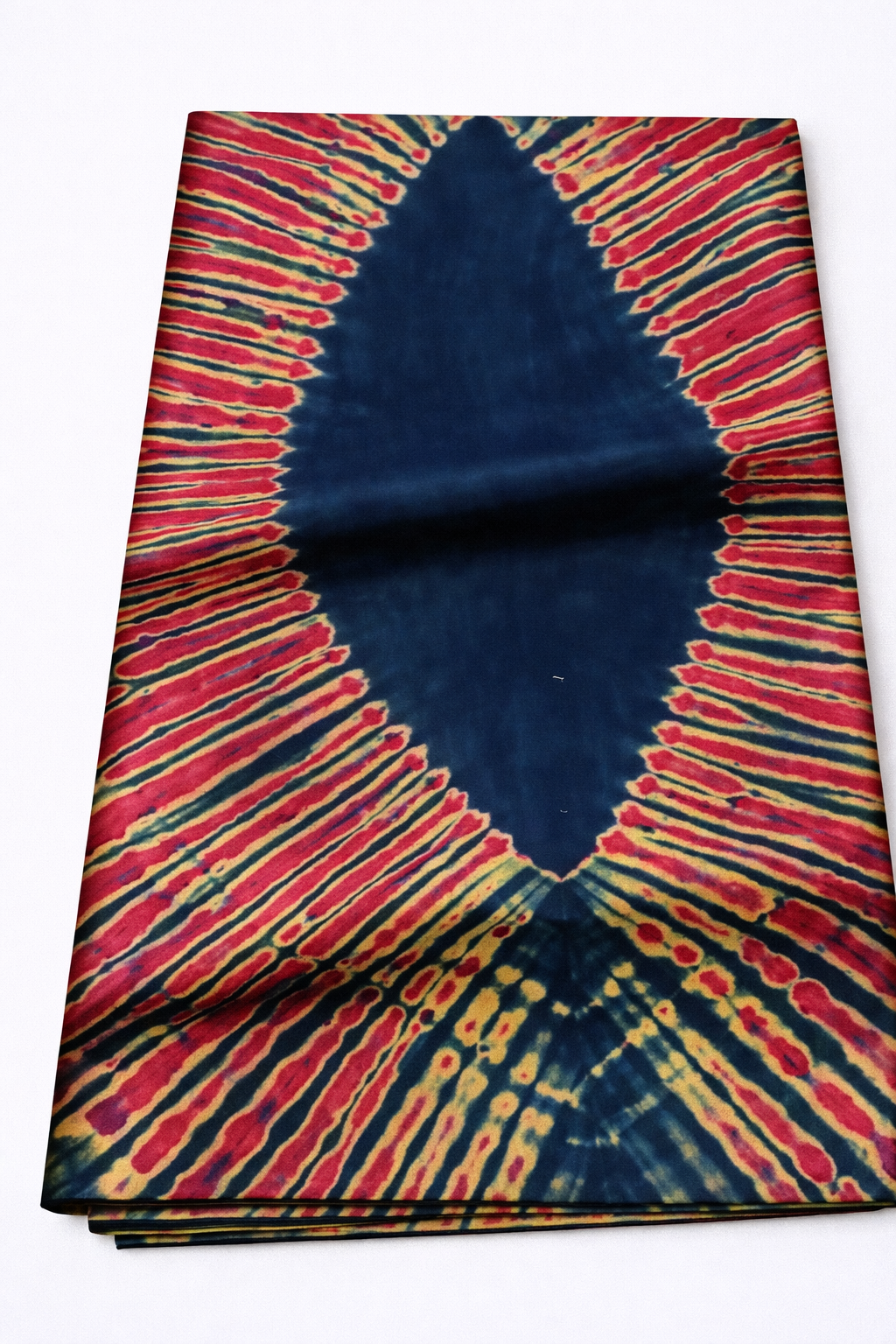 Featuring a classic midnight navy central motif, this fabric transitions into a radiant sunburst of coral red and sunny yellow. The sharp, rhythmic dye lines create a powerful sense of symmetry and movement, showcasing traditional West African craftsmanship with a bold, modern palette.