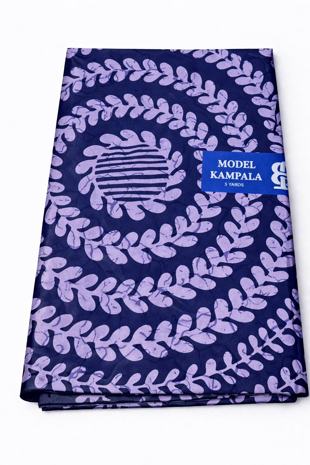 This high-quality Model Kampala textile features a dynamic, nature-inspired design in a regal deep navy and lavender-purple color palette. The fabric is part of the traditional Kampala/Adire tradition, which is highly valued for its artistic expression and cultural heritage.