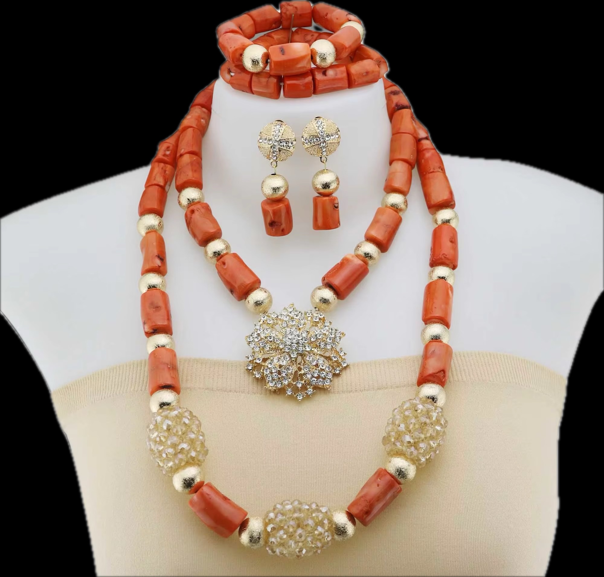 This luxurious coral bead set features multiple strands and intricately designed accessories, offering a statement of cultural pride and elegance. Ideal for weddings, naming ceremonies, or royal-themed events.