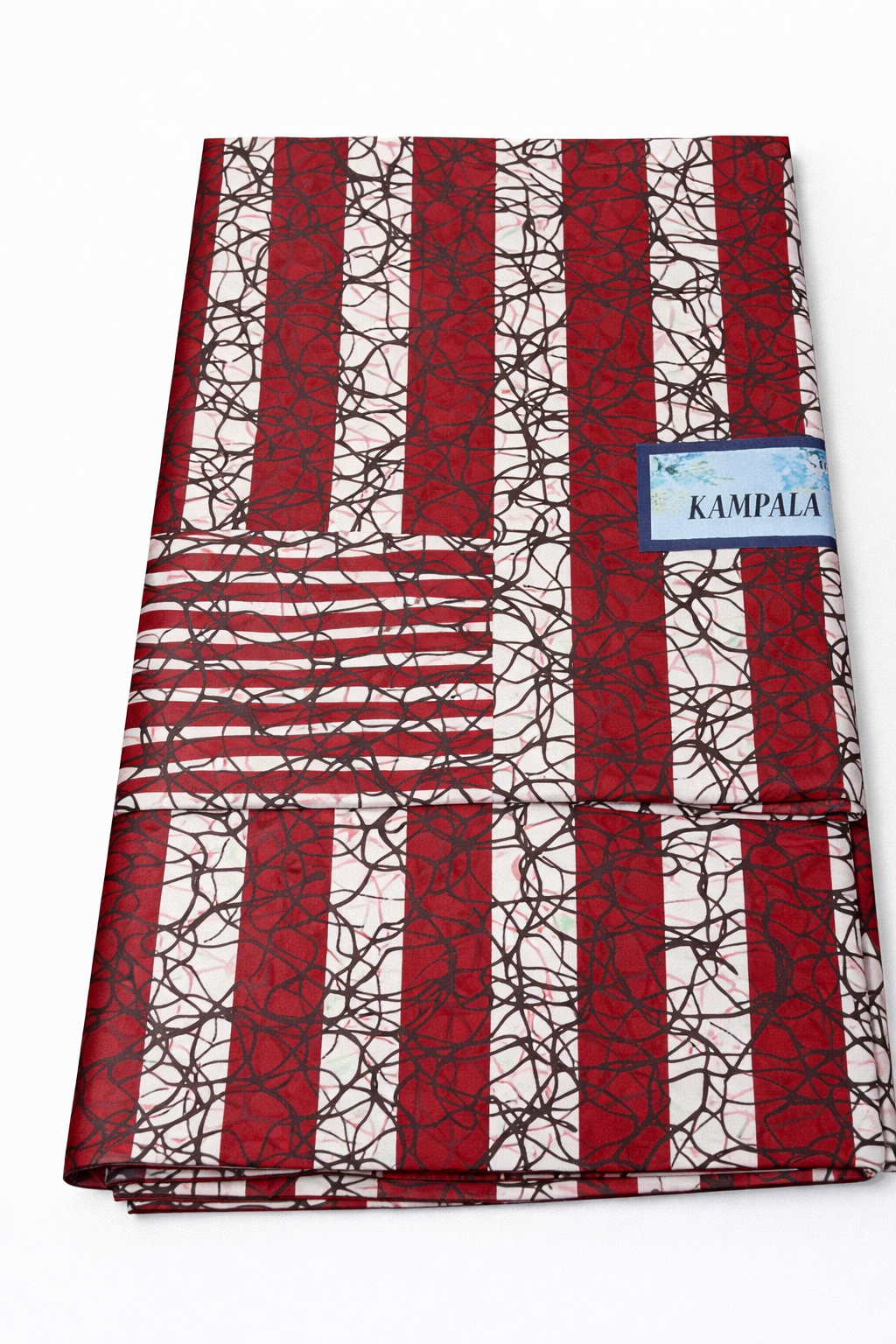 This vibrant Kampala fabric (a type of Nigerian Adire or wax-resist dyed textile) features a bold, contemporary aesthetic. It showcases alternating vertical and horizontal stripes in deep crimson red and crisp white.