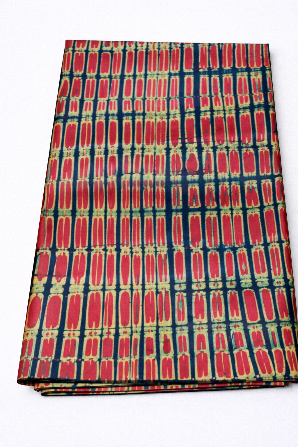 This complex design features a grid-like lattice of ruby red rectangles set within a deep navy and golden-yellow framework. The structured, geometric pattern provides a modern architectural feel while maintaining the organic texture of hand-dyed Adire.
