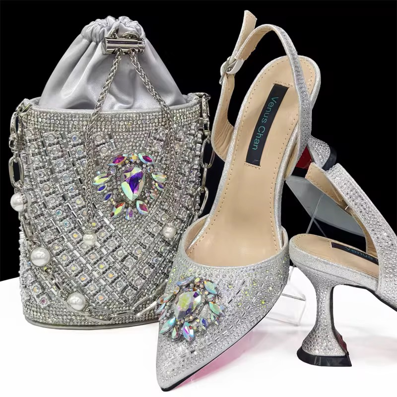 Shine with sophistication in this Luxury Shoes and Bag Set in silver, featuring chic sandals paired with a matching bag. Ideal for parties, weddings, and special occasions, this set offers a glamorous, luxurious look that radiates elegance and style.