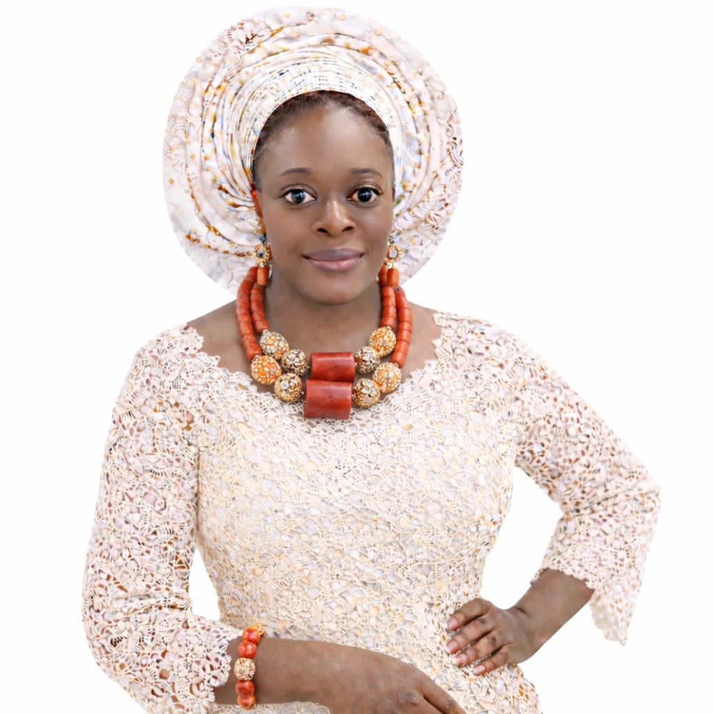 Redefine traditional elegance with a look that focuses on texture and scale. This set pairs the delicate, feminine patterns of ivory lace with “chunky” artisan jewelry. The centerpiece of this collection is the oversized barrel-cut coral stones, flanked by shimmering mosaic-style gold baubles, creating a visual weight that is both powerful and sophisticated.