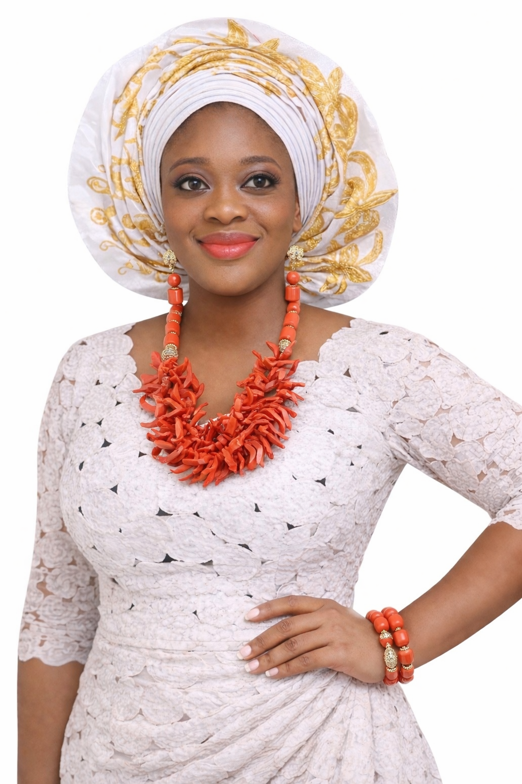 Elevate your ceremonial style with a look that celebrates organic geometry. While the garment features the classic elegance of our 3D honeycomb white lace and gold-embroidered Gele, the jewelry suite is the true showstopper. Utilizing a dense “cluster-branch” technique, the necklace mimics the natural form of reef coral, creating a voluminous and avant-garde silhouette.