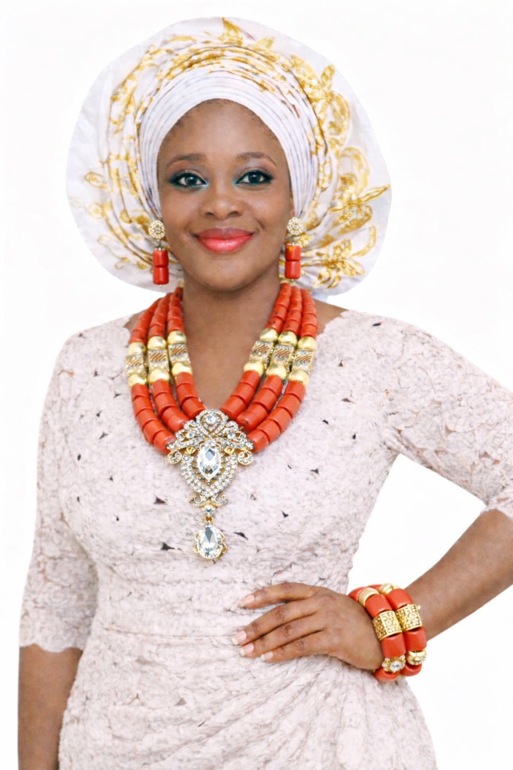 Exude an air of undeniable prestige with this meticulously crafted set. The garment features our signature high-definition white 3D lace, providing a textured, luxurious foundation. The jewelry suite is a masterpiece of “more is more” design, featuring three tiers of polished coral beads anchored by a massive, crystal-encrusted gold pendant that captures light from every angle.