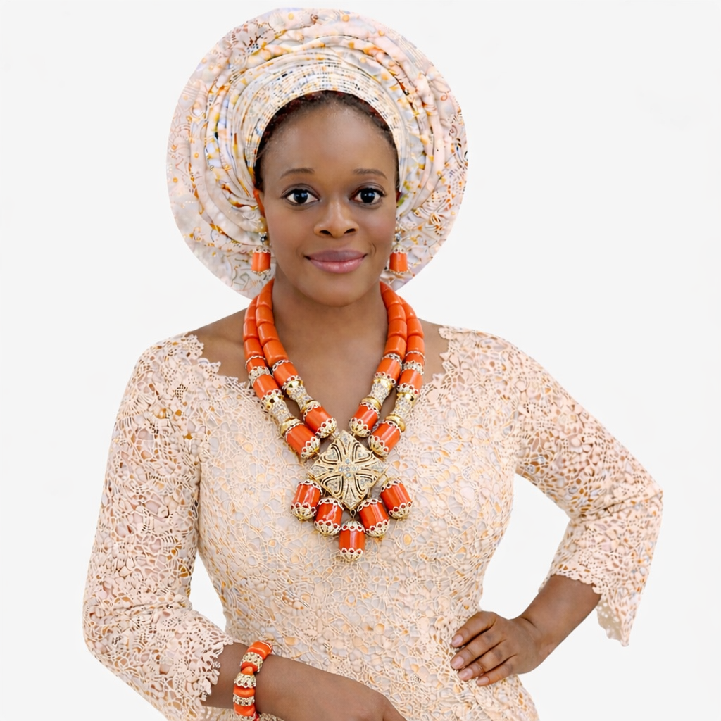 Step into the spotlight with a look that defines grace and cultural authority. This set features a high-definition cream lace garment paired with a striking architectural Gele. The centerpiece is the jewelry: a unique blend of bold coral cylinders and intricate gold filigree metalwork that offers a vintage, regal aesthetic.