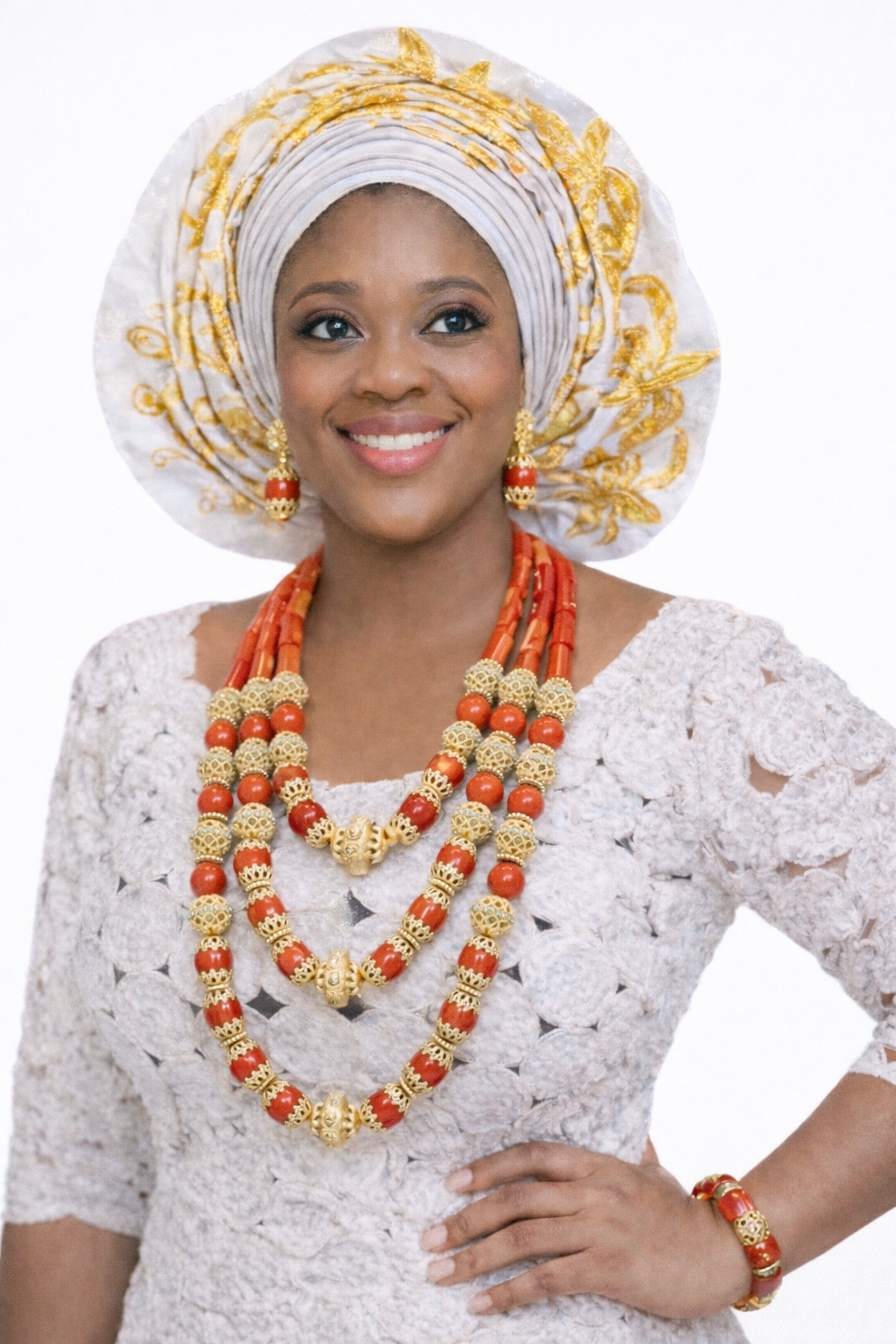 Radiate pure elegance with a set designed for maximum visual impact. This collection features a rich, textured white lace bodice paired with a lavishly embroidered Gele. The jewelry suite is a masterpiece of craftsmanship, utilizing a “caged” gold technique that encapsulates each coral bead, creating a look of opulence and historical prestige.