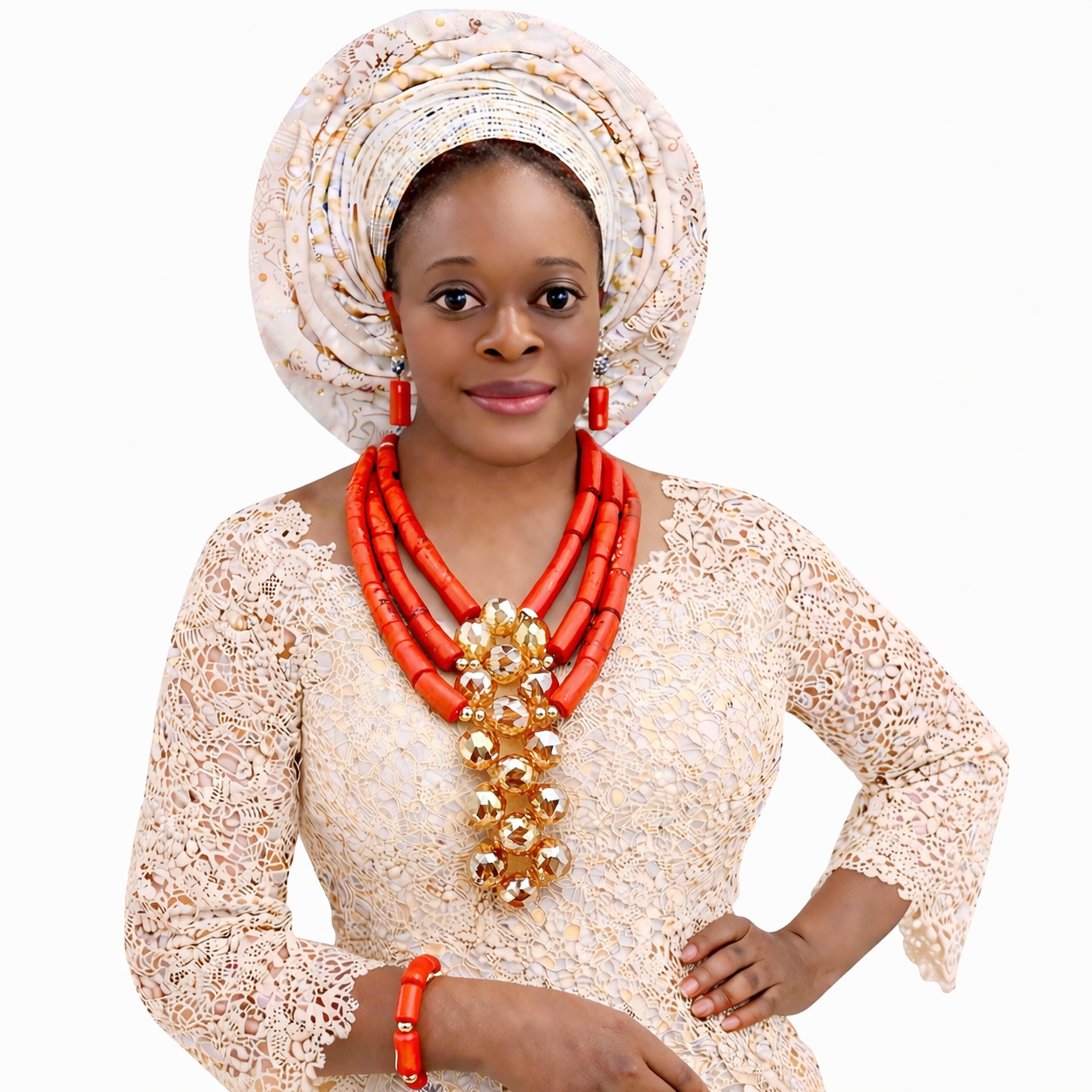 Exude royalty and elegance with a look designed for the most prestigious occasions. This set features a high-quality, intricately patterned lace bodice paired with a meticulously pleated Gele (headtie) and a monumental coral bead collection that signifies wealth, status, and cultural pride.
