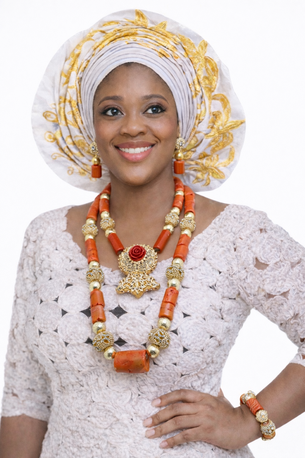 Make an unforgettable entrance with a look that blends intricate textures with romantic symbolism. This set pairs a heavy, dimensional white lace with a gold-embroidered Gele. The jewelry suite stands out with a double-strand coral necklace featuring a magnificent gold filigree “fan” pendant topped with a delicate red rose, symbolizing love and beauty.