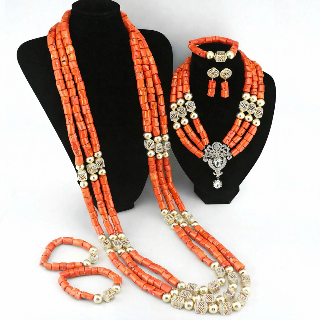 Make a grand, unified entrance with a collection that defines royalty. This set moves away from traditional gold in favor of a sophisticated silver-and-crystal aesthetic. While the Bride’s Set focuses on intricate filigree and brilliant sparkle, the Groom’s Set emphasizes volume, length, and the commanding presence of silver-capped coral.