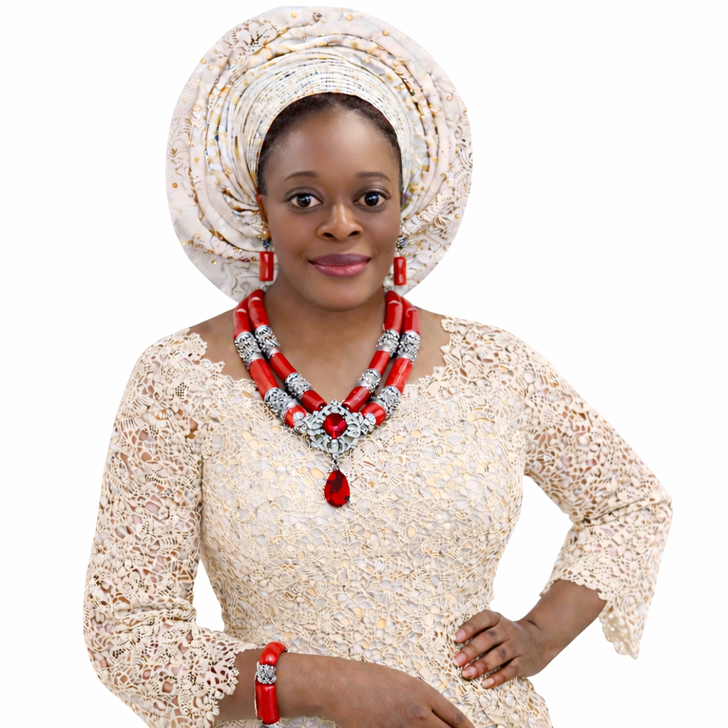 Command attention with a look that balances traditional heritage with contemporary metallic styling. This set features the signature high-quality cream lace and architectural Gele, but pivots to a majestic silver-finished jewelry suite. The inclusion of a large teardrop crystal centerpiece adds a touch of “old-world” glamour to the vibrant coral beads.