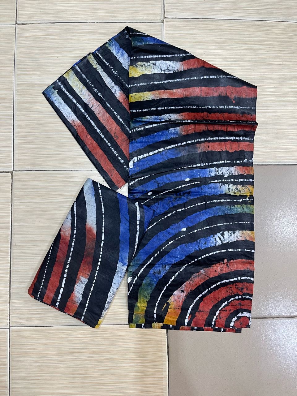 This stunning 5-yard Tri-Color Batik Brocade fabric features a rich combination of burgundy, soft sky blue, and shimmering gold accents. The intricate batik detailing and brocade texture create a luxurious finish, making it ideal for traditional attire, statement garments, and cultural celebrations. A perfect choice for anyone seeking vibrant color with an elegant twist.