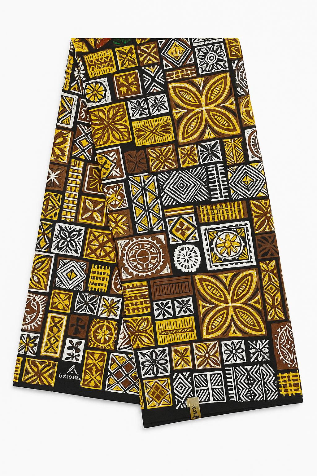 This high-quality African Wax Print fabric features a sophisticated earth-tone palette of mustard yellow, chocolate brown, black, and white.