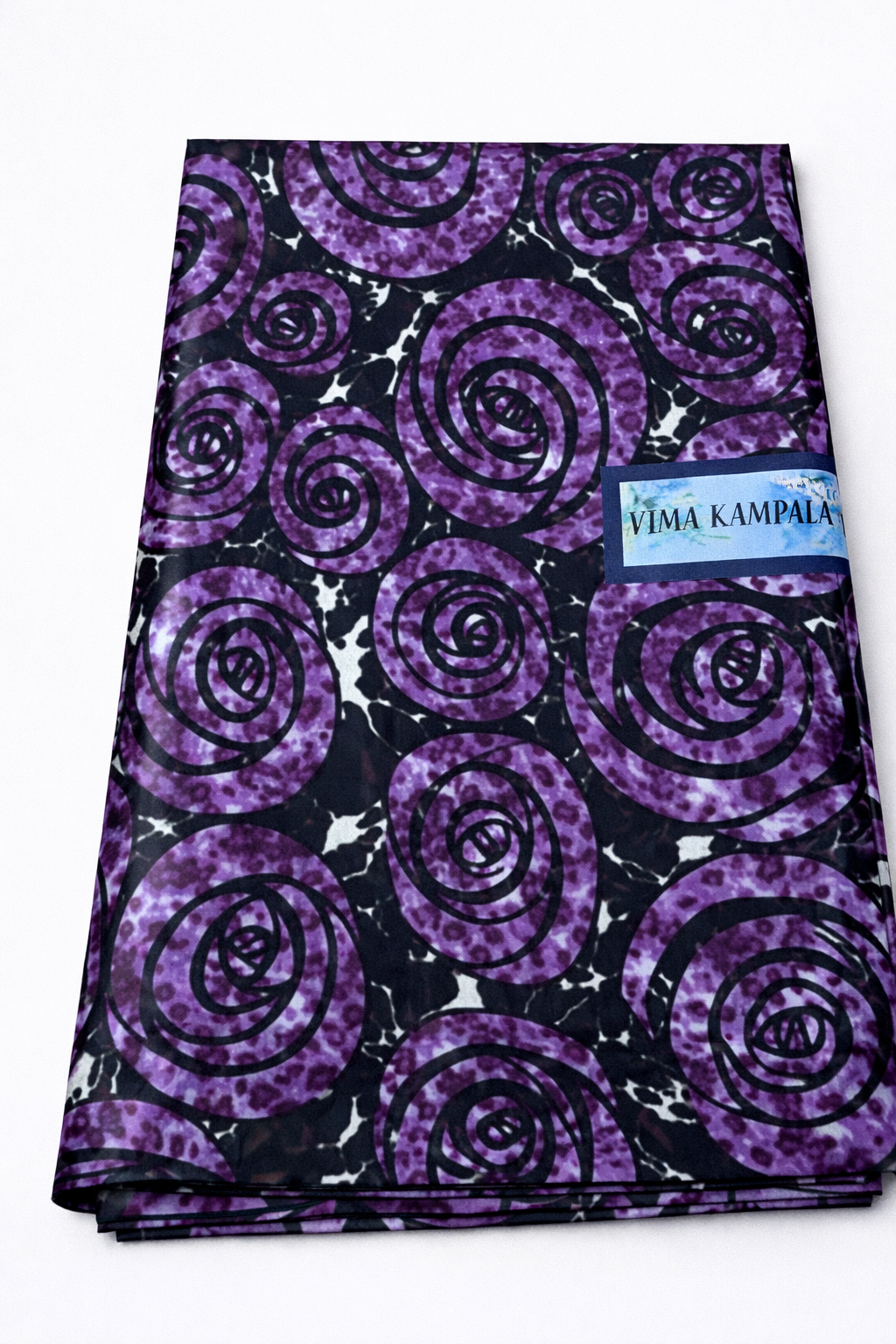 This vibrant textile from the Vima Kampala collection features a mesmerizing, large-scale organic design in a regal plum-purple and obsidian color palette. The fabric highlights the traditional batik resist-dyeing technique, resulting in a rich, multi-dimensional aesthetic.