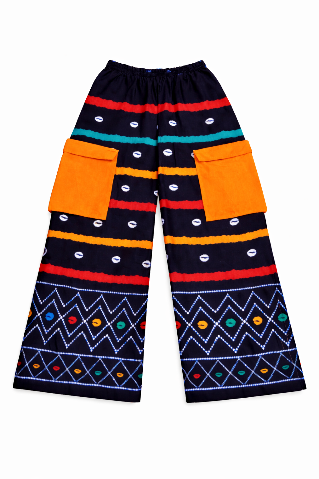 These bold, wide-leg palazzo pants feature a vibrant African Wax Print with horizontal stripes in red, yellow, and teal set against a black background. The design is accented by small white shell motifs and an intricate geometric zigzag pattern at the hem.