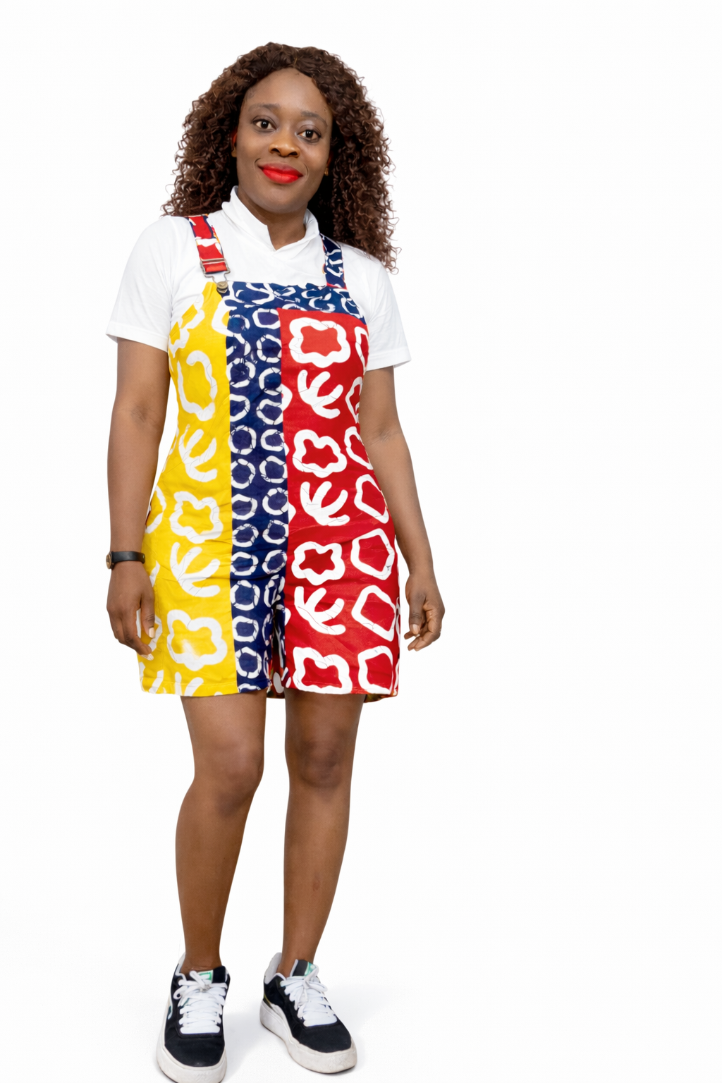 Stand out in this vibrant 2-piece casual party set featuring a bold, multi-colored African print. The ensemble includes short overalls with a high-contrast geometric and floral motif in striking shades of red, yellow, and navy blue, layered over a classic white short-sleeved t-shirt.